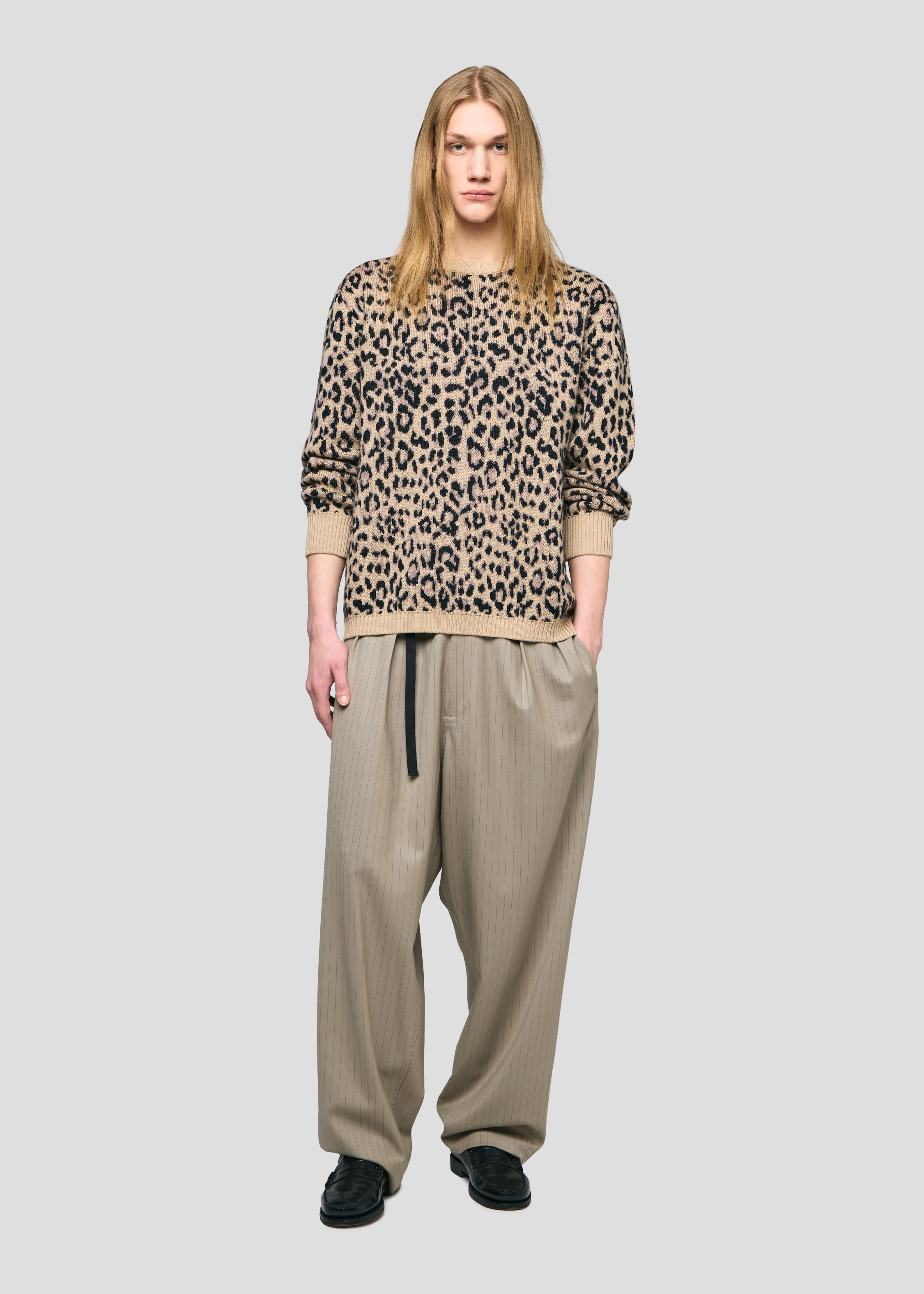 The animalier staple in a jacquard merinos and mohair crewneck. One classic design and one tone on tone black and grey. 7 gauge.