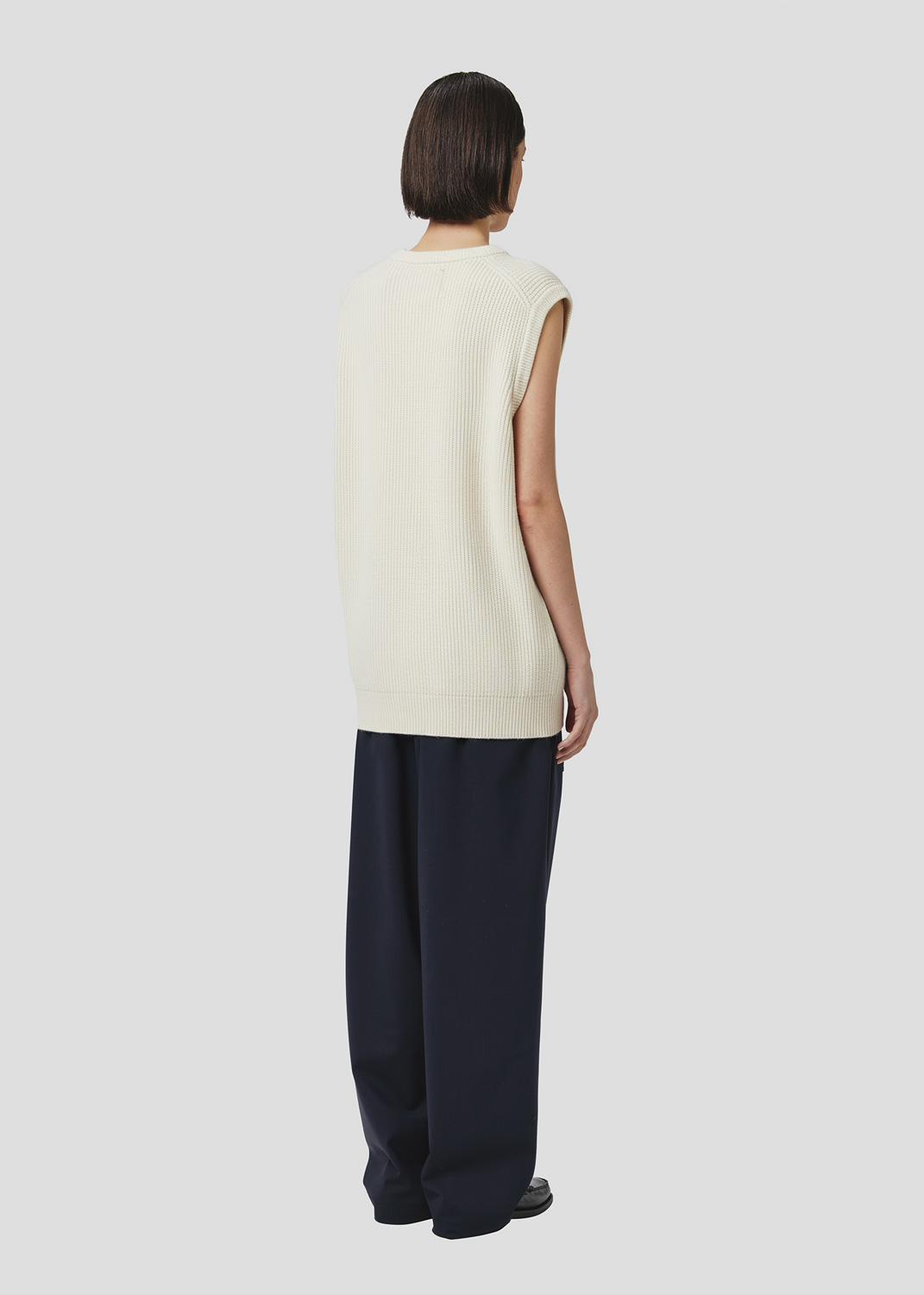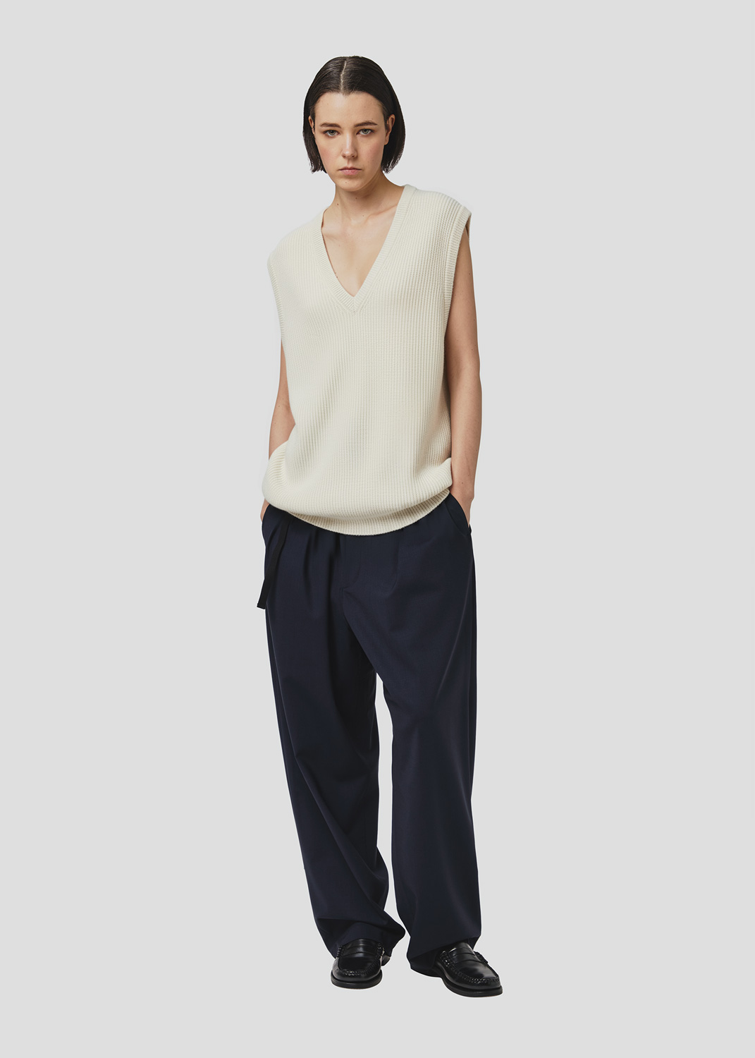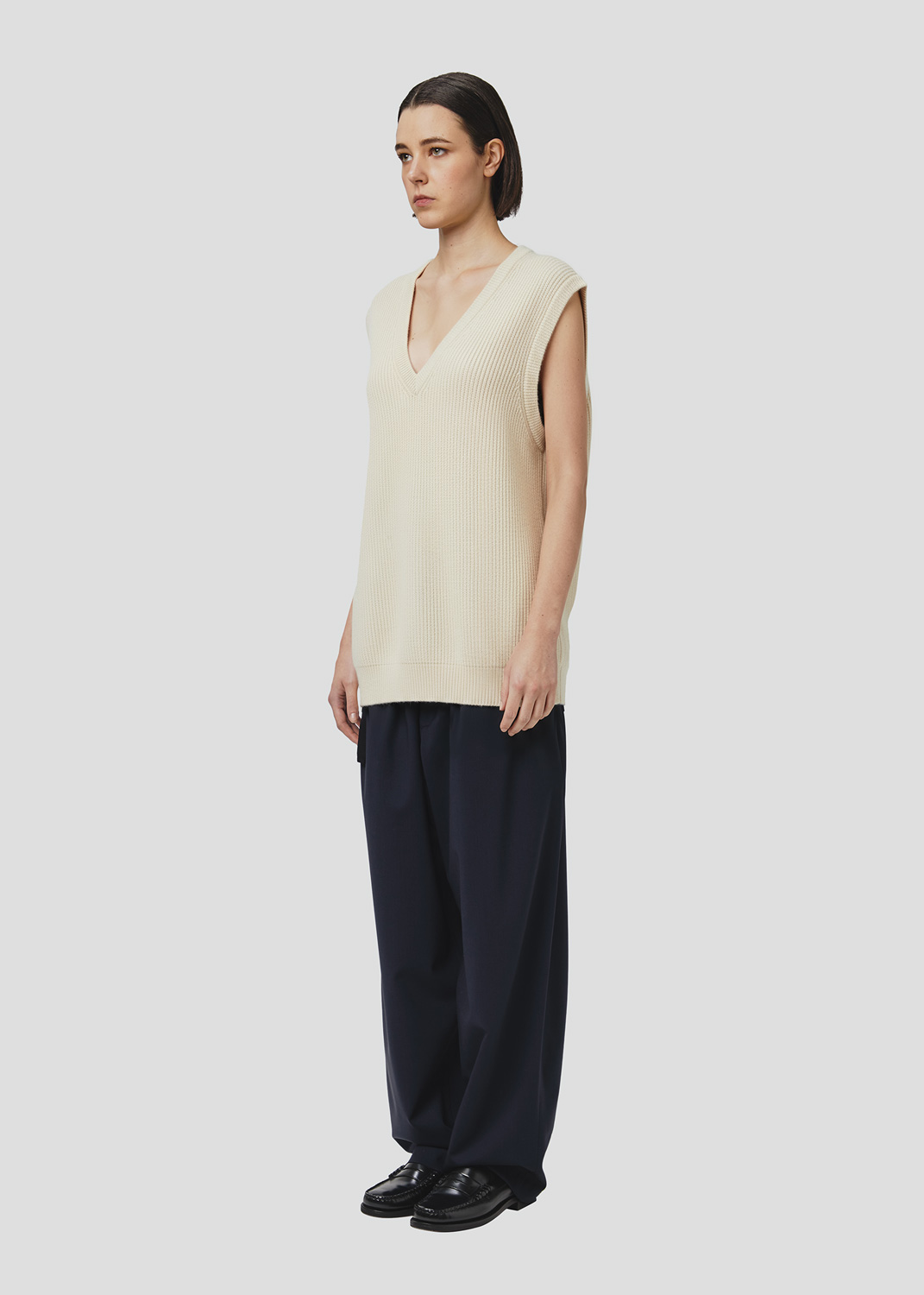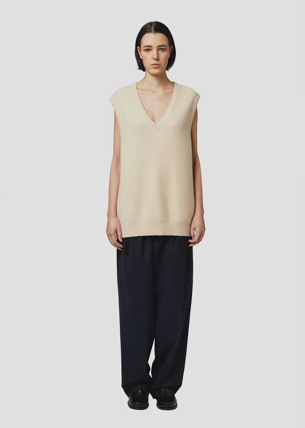 The English rib vest sweater has a slighlty oversized fit and a very deep v-neck, which gives it a contemporary look. Realized in 100% merino wool, is presented in a color palette which combines classic colors as black, blue, grey, cream, with seasonal accents of burgundy, nuts and green.