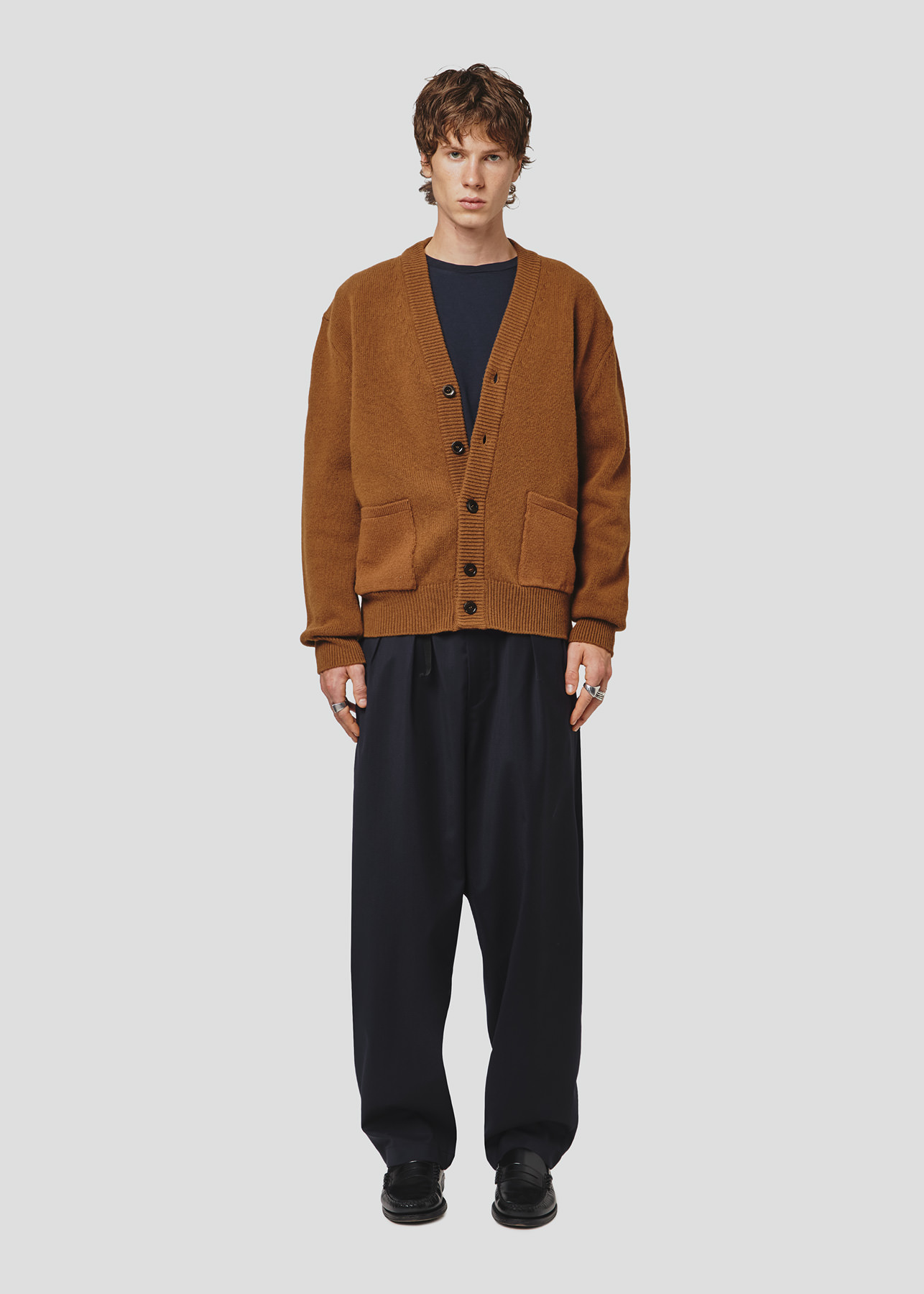 This lambswool cardigan is a contemporary take of a classic, with a slightly boxy fit. 7 gauge.
