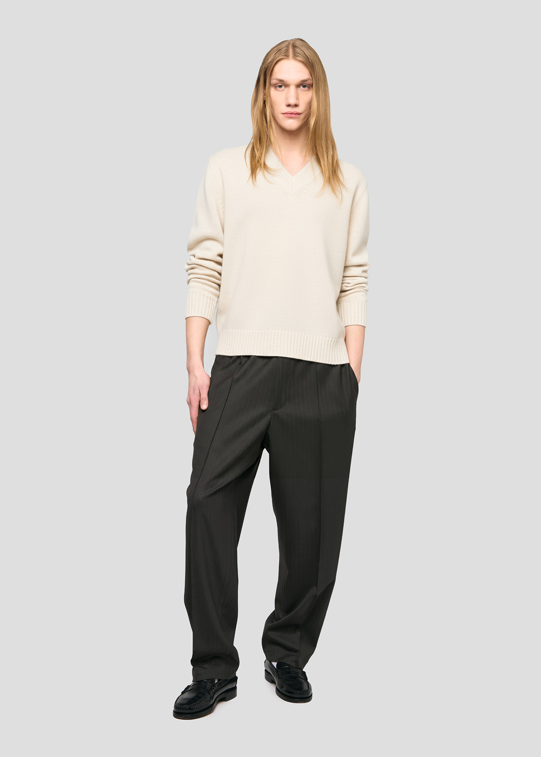 A contemporary V-neck in a soft lambswool and bright colours. 7 gauge.