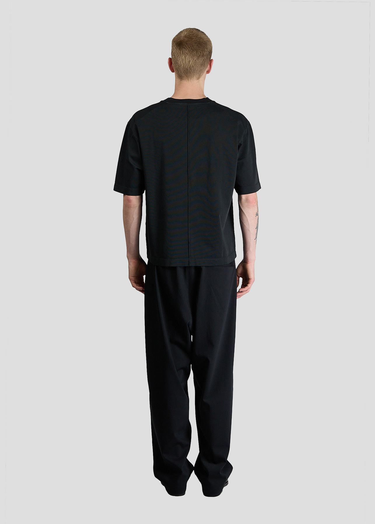 The new heavy jersey short sleeve crewneck has a boxy fit, bigger rib and detail of the visible stitching on the back.
