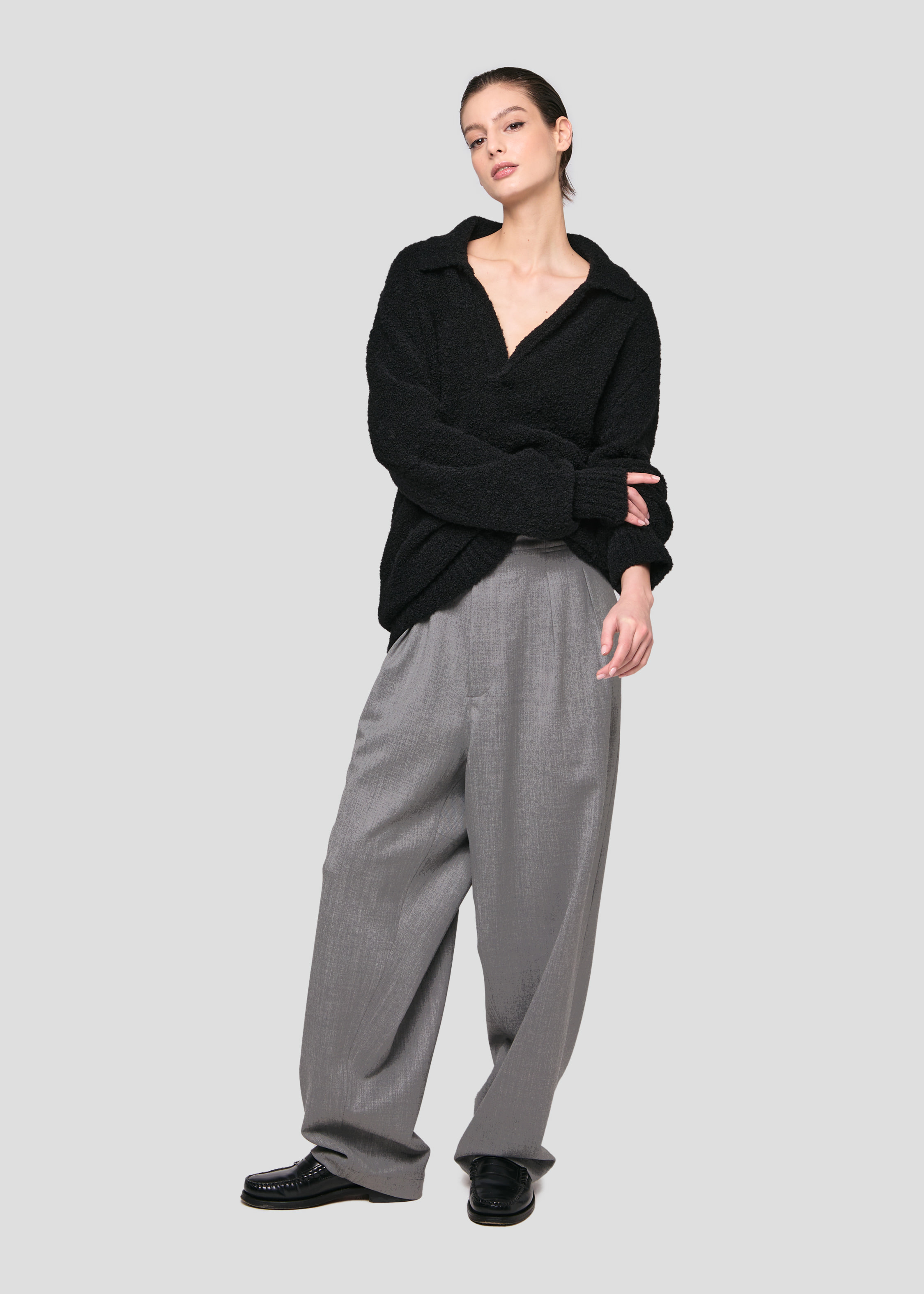 Una serie in bouclé invernale che include un maglione girocollo e un maglione polo. 5 gauge.