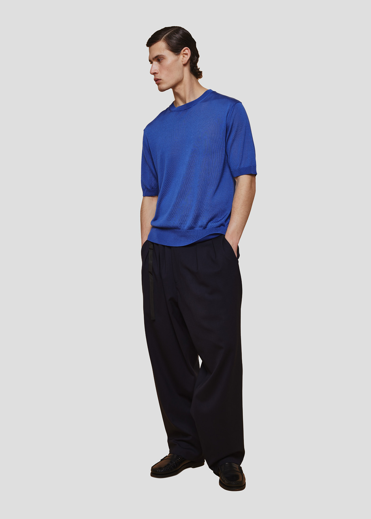Realizzato in lyocell ultra leggero, presenta una struttura fine e ariosa che garantisce massima traspirabilità e una sensazione fresca sulla pelle. La texture fluida e quasi impalpabile dona al capo un’eleganza essenziale e contemporanea.
