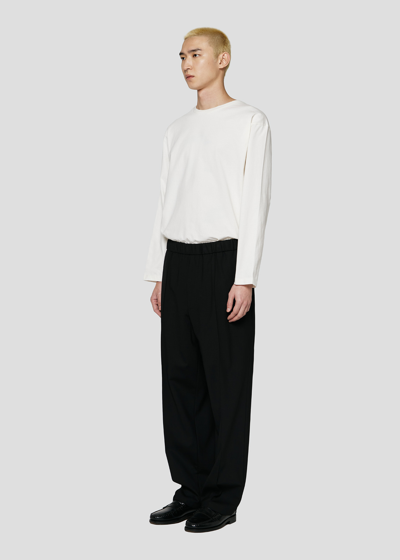 Il design è caratterizzato da pences frontali che conferiscono volume controllato e profondità alla silhouette. La vita elasticizzata introduce un elemento funzionale e rilassato, creando un contrasto moderno tra costruzione tailoring e comfort quotidiano.