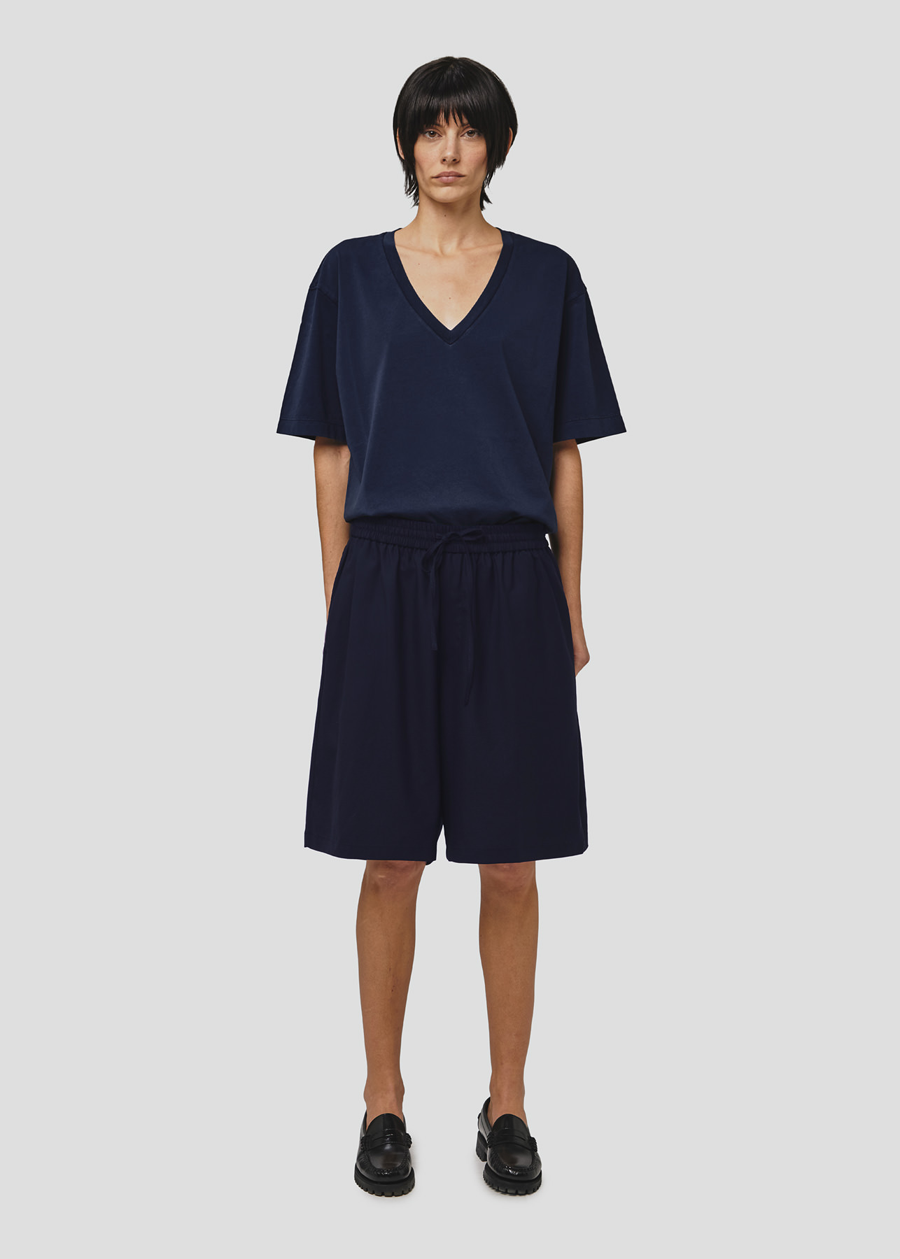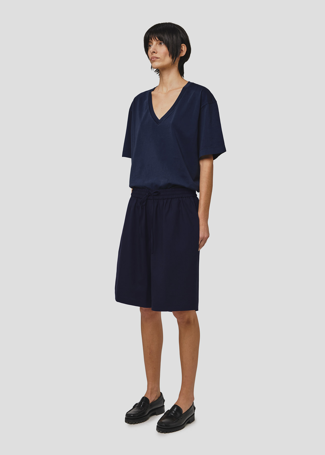 Il design si distingue per la vita elasticizzata con coulisse, che richiama l’estetica basket e dona un’attitudine rilassata, mentre la lunghezza al ginocchio e il volume ampio definiscono una silhouette moderna e bilanciata.