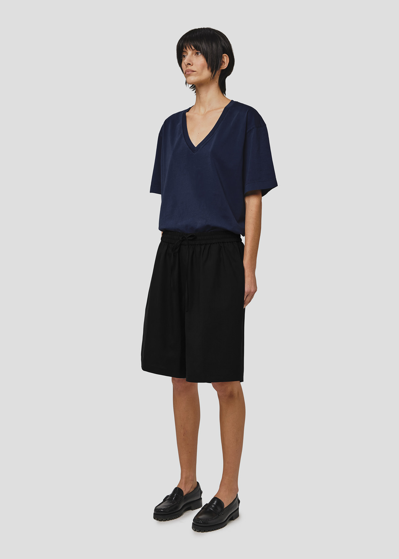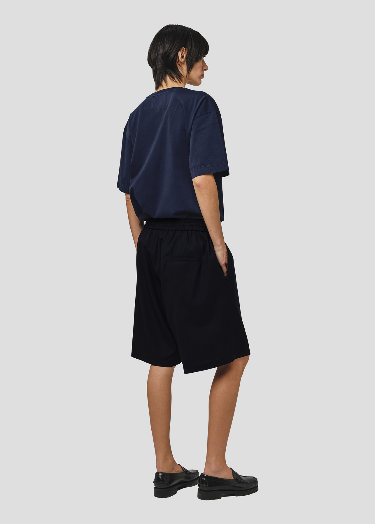 Il design si distingue per la vita elasticizzata con coulisse, che richiama l’estetica basket e dona un’attitudine rilassata, mentre la lunghezza al ginocchio e il volume ampio definiscono una silhouette moderna e bilanciata.