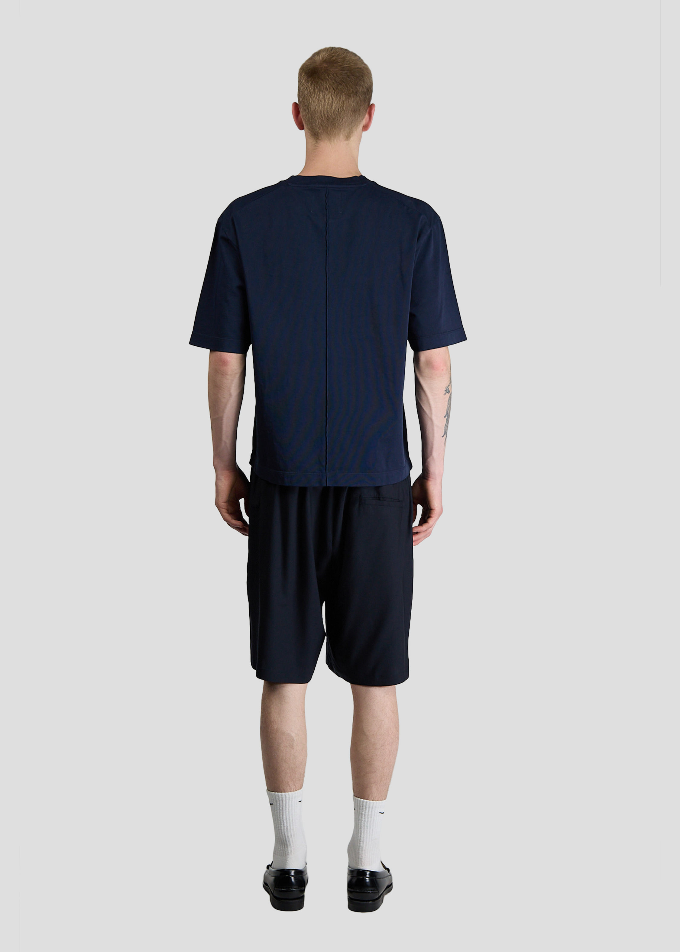 Il nuovo girocollo a maniche corte in jersey pesante presenta una vestibilità boxy, coste più ampie e un dettaglio di cuciture a vista sulla schiena.
